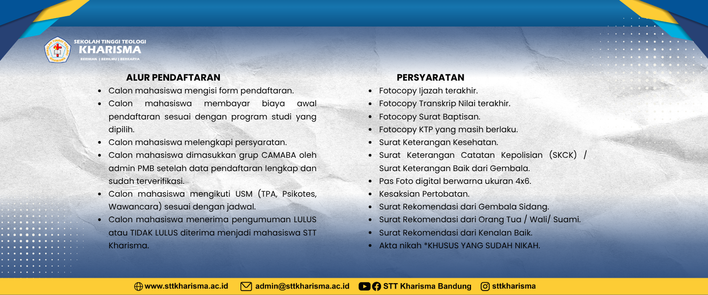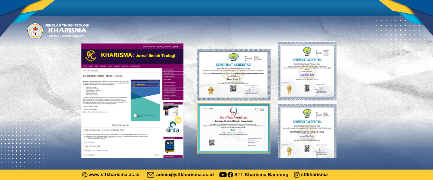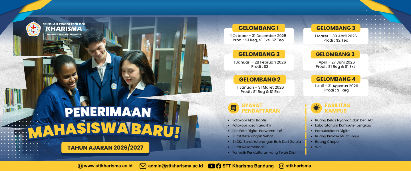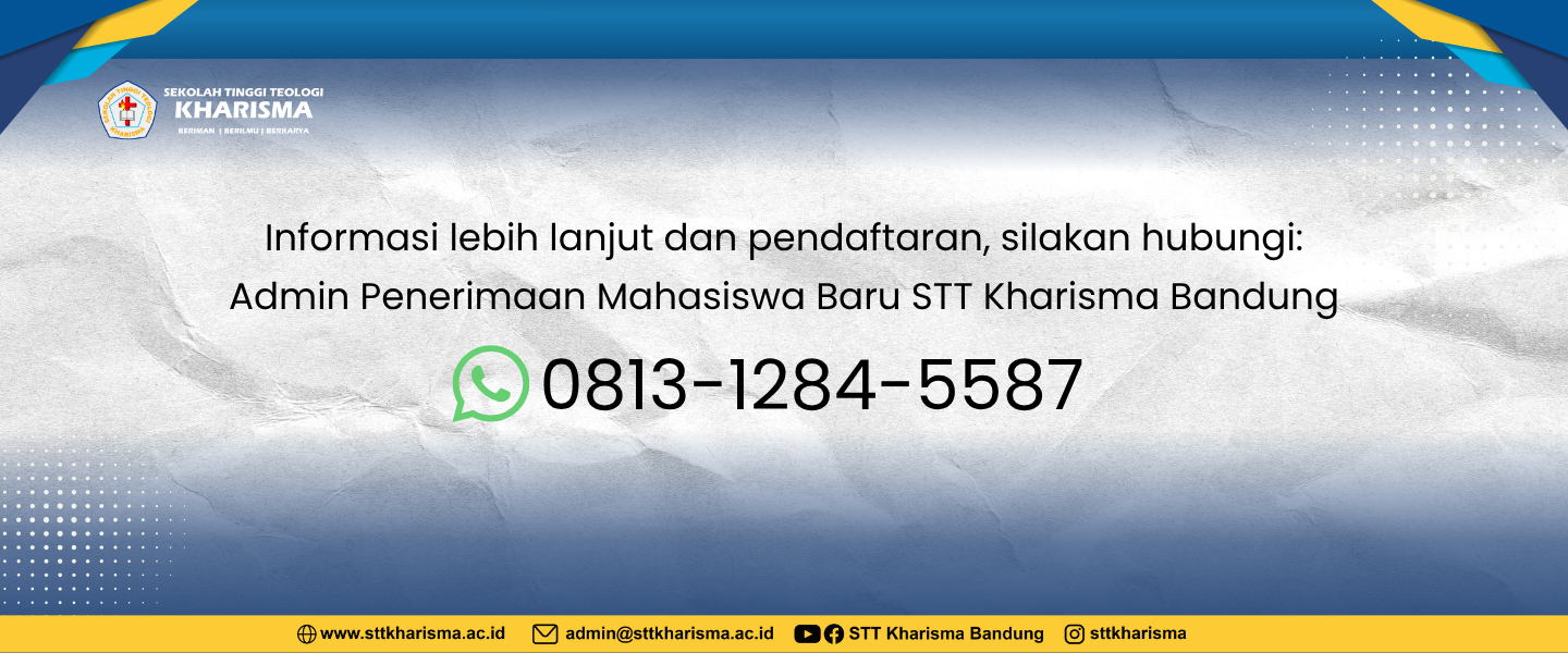 “Sekolah Tinggi Teologi Kharisma adalah lembaga Pendidikan Tinggi Teologi yang menekankan keseimbangan antara wawasan keilmuan dengan praktik lapangan. Setiap mahasiswa dididik dengan disiplin ilmu yang bermanfaat dalam bidang Teologi & Pendidikan Kristen, serta diberi kesempatan untuk mengimplementasikannya dalam ladang pelayanan.”